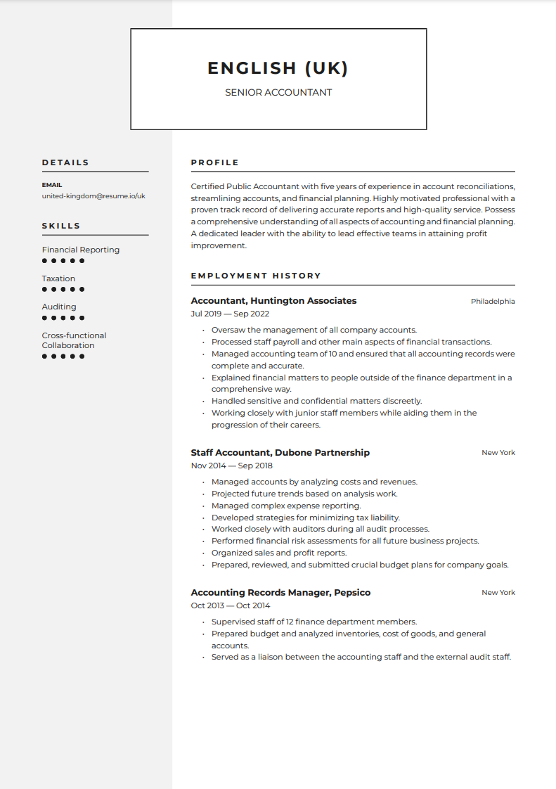 In the above example of an accountant resume, the applicant has extensive experience that necessitates adding a second page. Especially when your resume includes specific accomplishments and metrics, you may need more space to convey all of the important information.