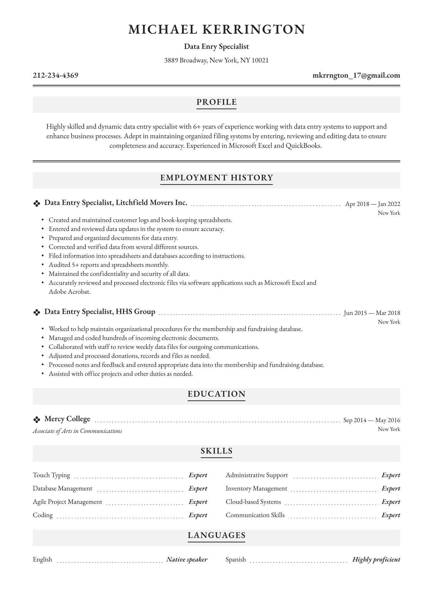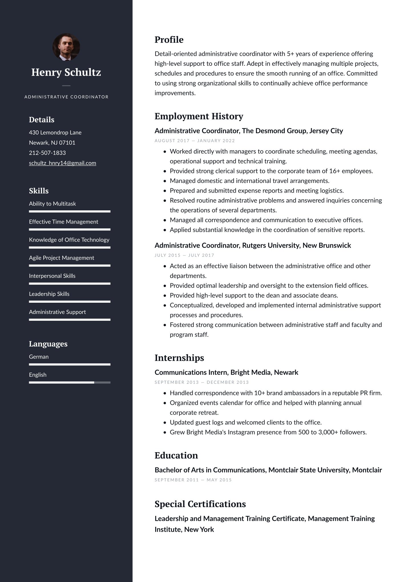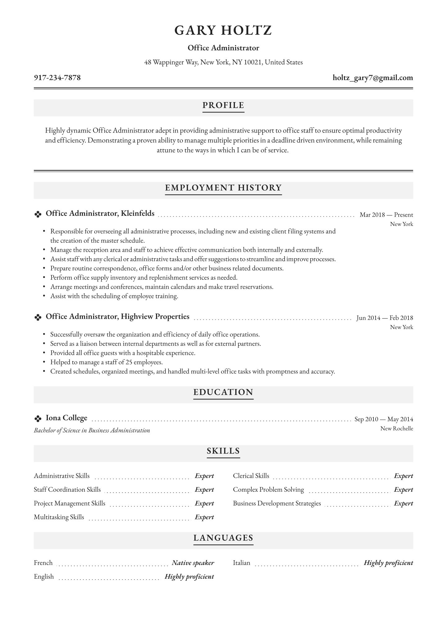 Many administrative professionals learn on the job and that’s great. That means your education section will consist of your high school diploma or GED. If you have taken any administrative courses or have a higher degree, list those here as well.