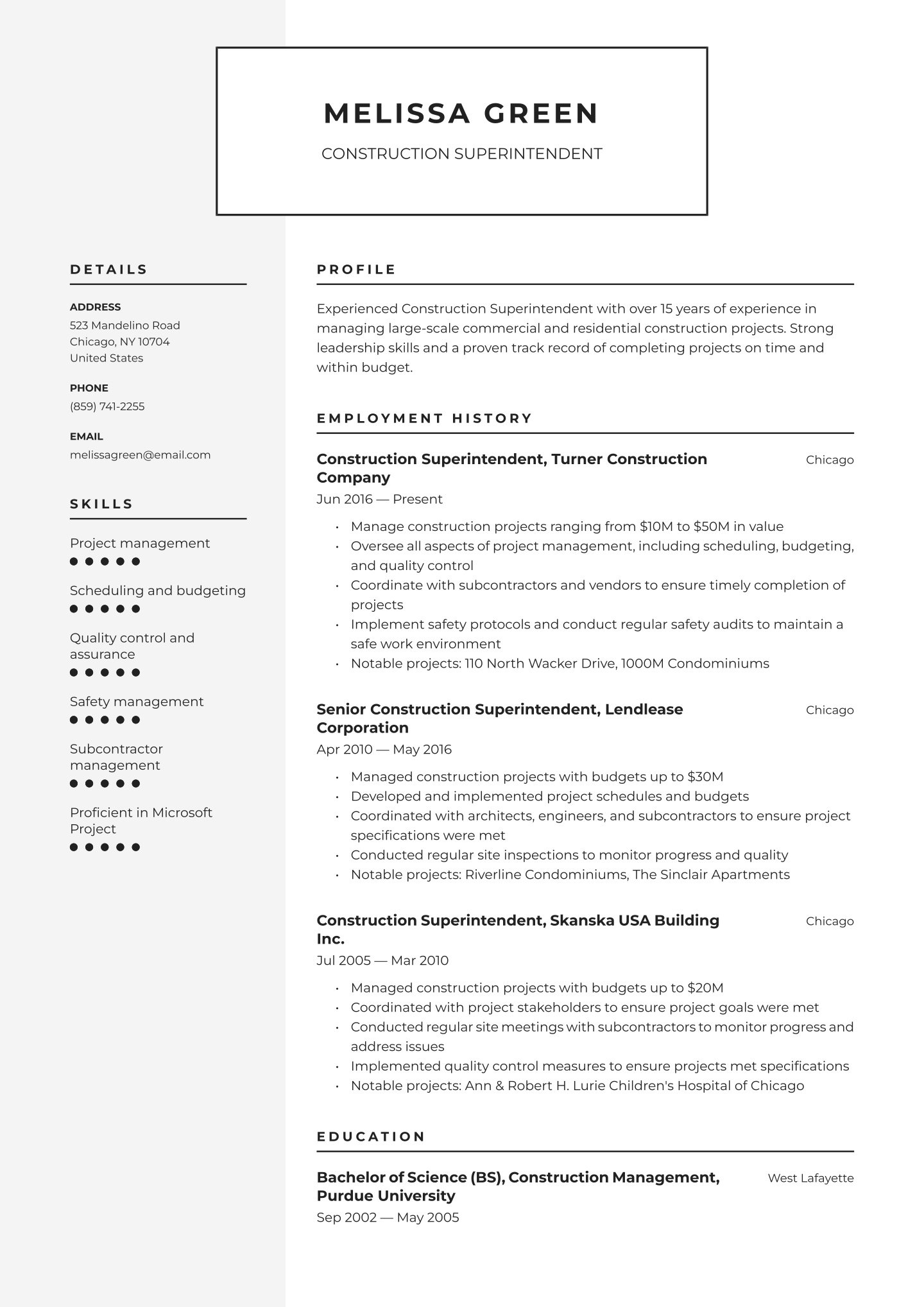 This architect resume example is designed to walk you through all the steps of building the perfect resume. Combined with our adaptable resume samples plus our customizable resume templates, you’ve got all the tools you need to land your next dream job.