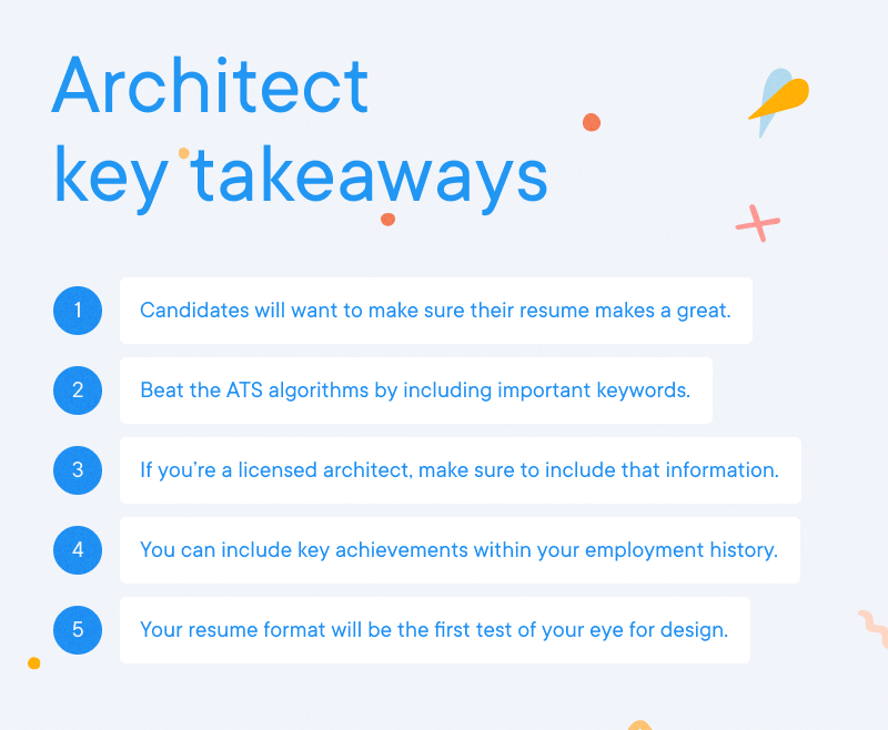 - As the job market for architects grows increasingly competitive, candidates will want to make sure their resume makes a great impression right from the start.