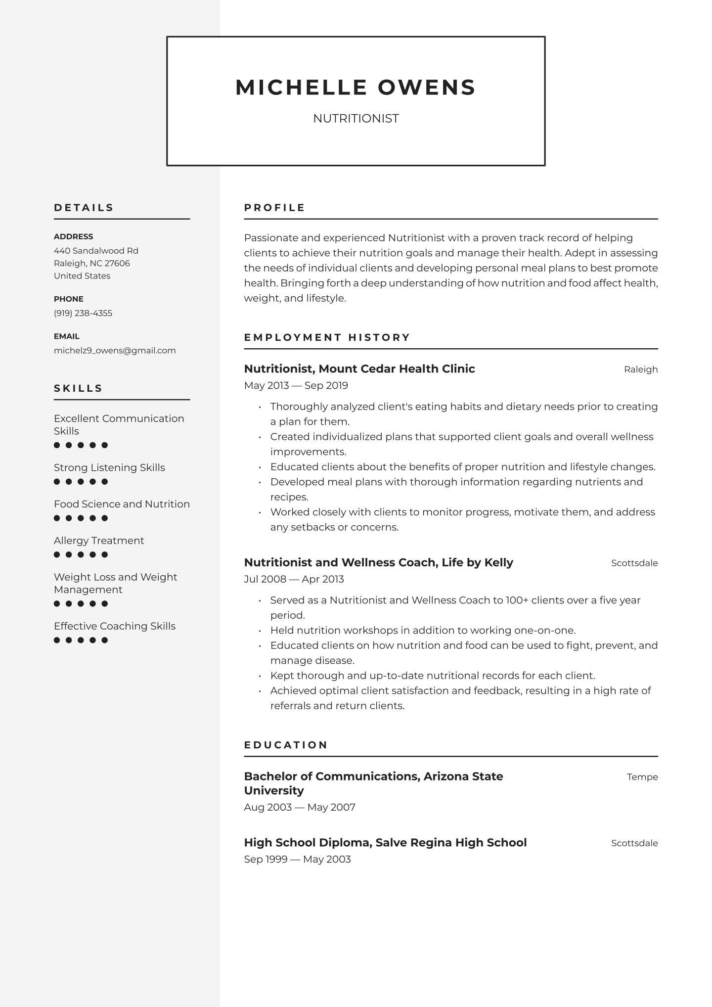 - Advice on each resume section: header, summary, work history, education and skills