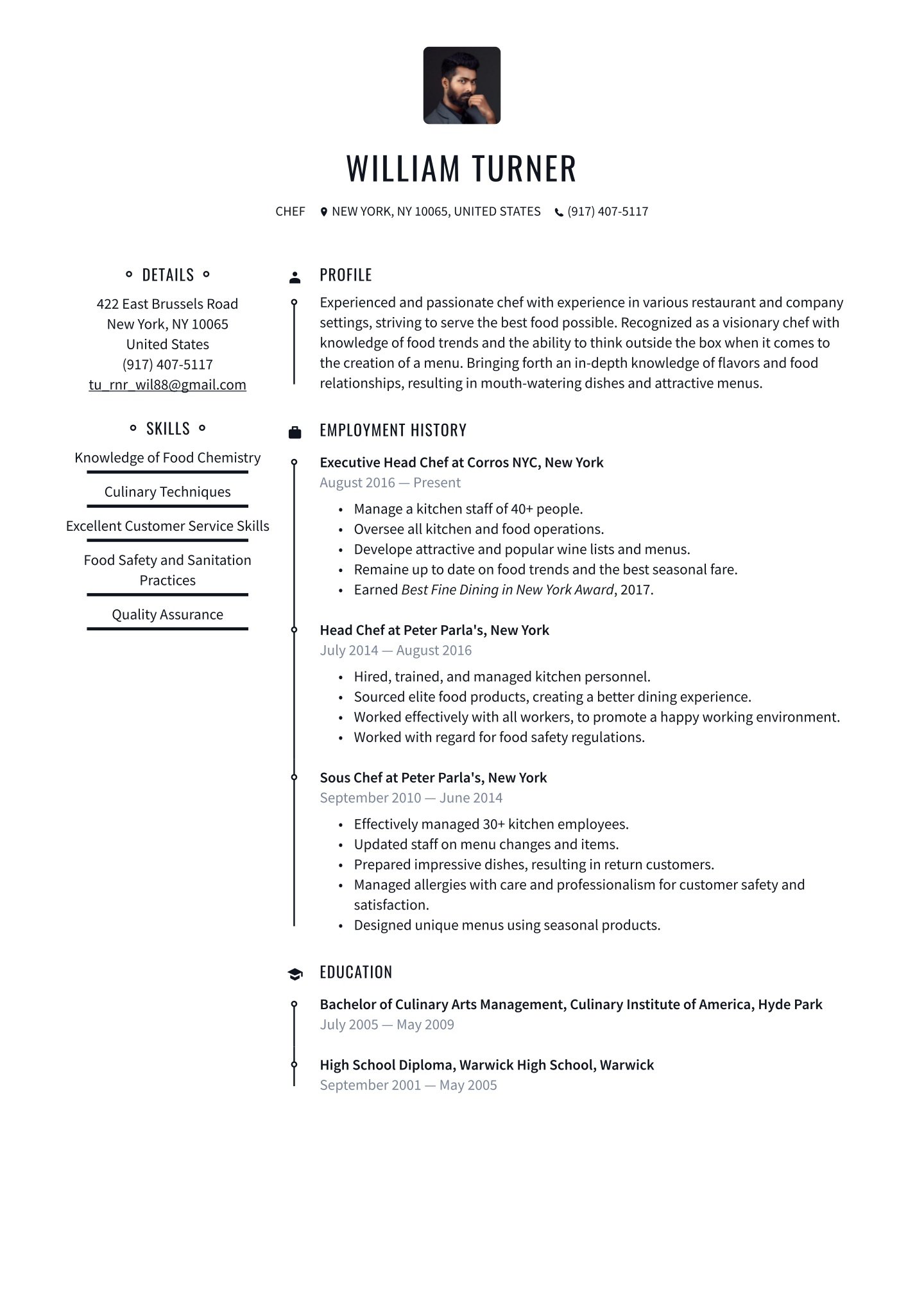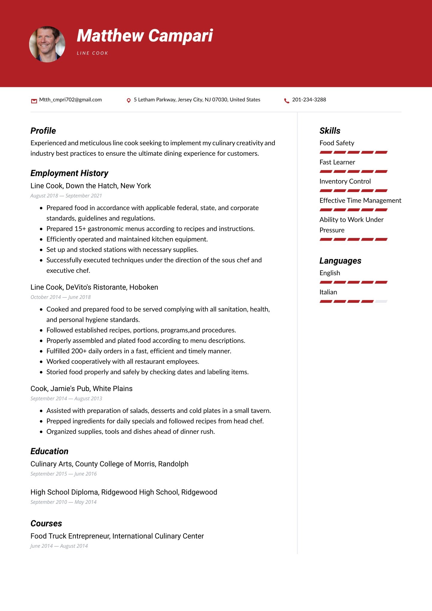 If you want further illumination on this important section, here are some related resume samples you can check out. If you have niche skills, try our sommelier resume example or our pastry resume example. We also offer a caterer resume example. Entry-level workers should click on the food service resume example, or if coffee is your drink, try our barista resume example.