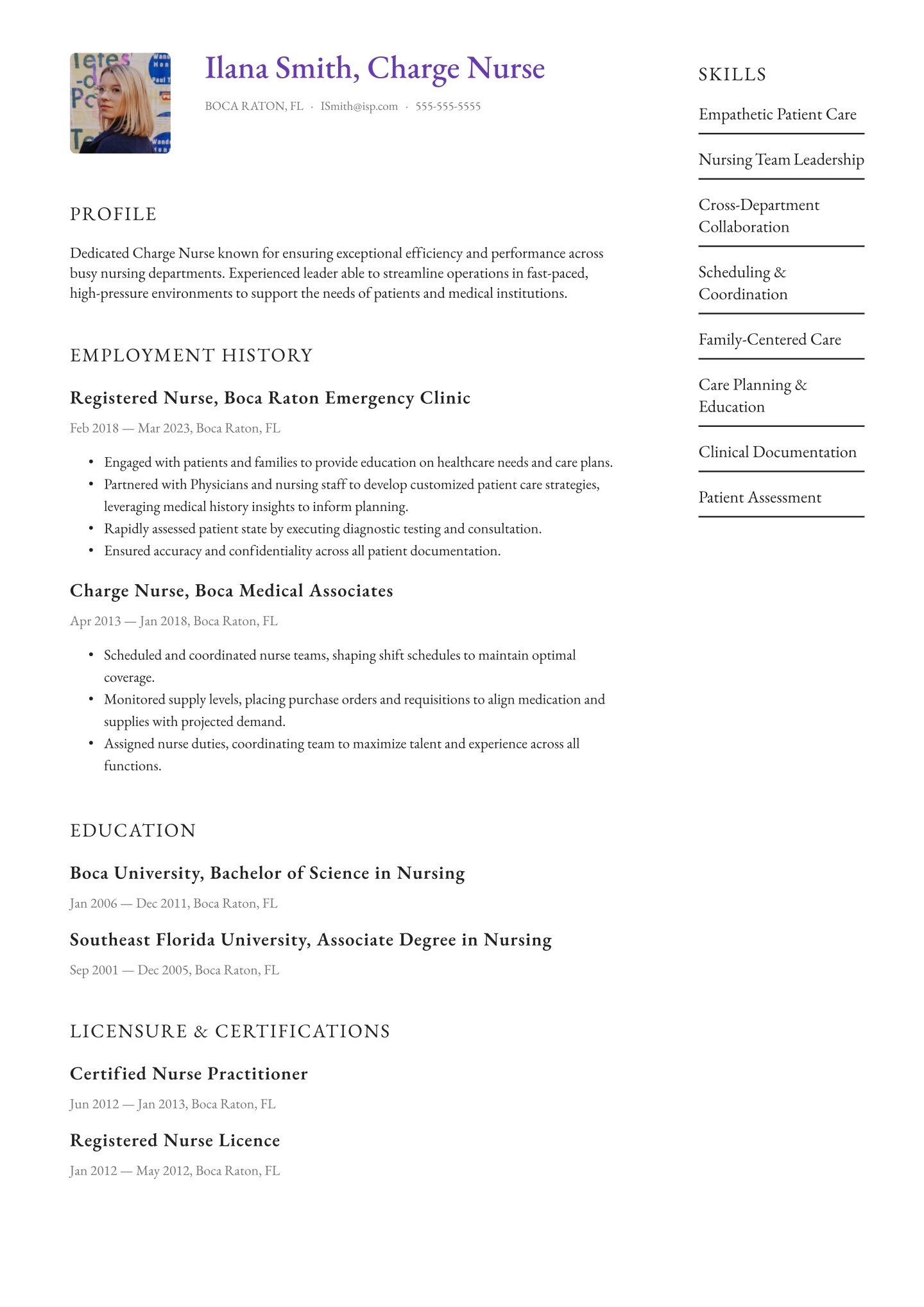 - If you're a new nursing graduate with no work experience, place your education section first, right below the summary.